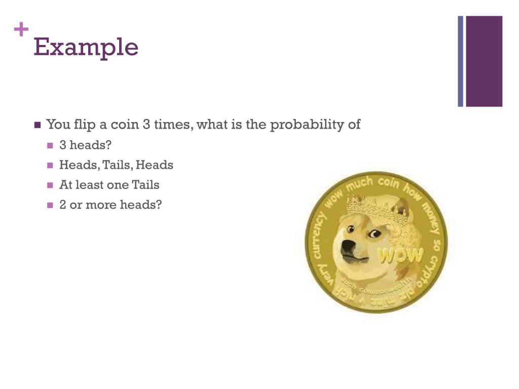 Example • You flip a coin 3 times, what is the probability of • 3 heads? • Heads, Tails, Heads • At least one Tails • 2 or more heads?