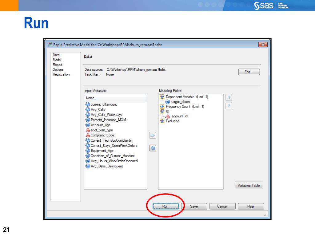 Invoking and Running the SAS Rapid Predictive Modeler Task Churn Case Study Task: Invoke and execute the Rapid Predictive Modeler task in SAS Enterprise Guide.