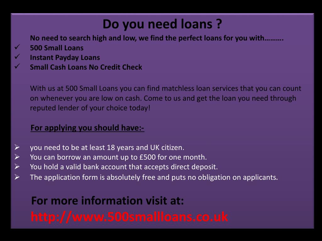 Do you need loans ? • No need to search high and low, we find the perfect loans for you with………. • 500 Small Loans • Instant Payday Loans • Small Cash Loans No Credit Check
