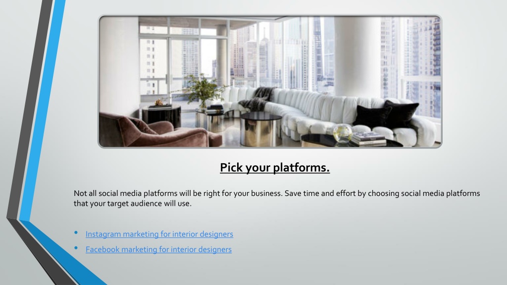 Pick your platforms. Not all social media platforms will be right for your business. Save time and effort by choosing social media platforms that your target audience will use. Instagram marketing for interior designers Facebook marketing for interior designers