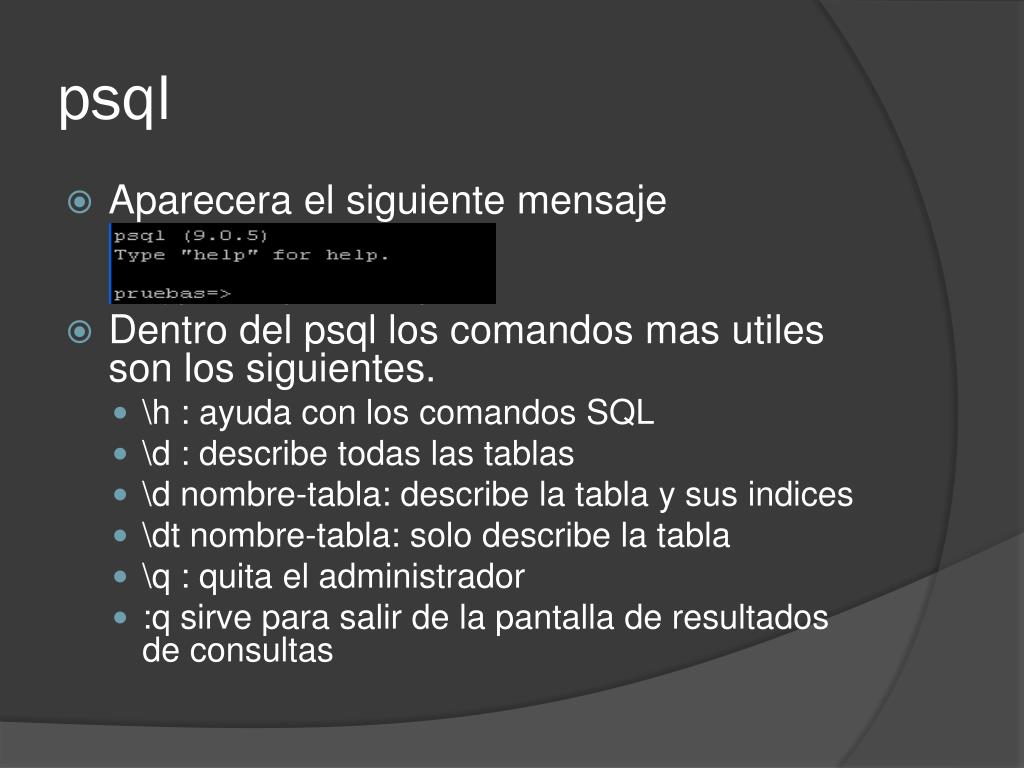 psql • Aparecera el siguientemensaje • psql (9.0.5) • Type "help" for help. • Dentro del psql los comandos mas utiles son los siguientes. • \h : ayuda con los comandos SQL • \d : describe todas las tablas • \d nombre-tabla: describe la tabla y sus indices • \dt nombre-tabla: solo describe la tabla • \q : quita el administrador • :q sirve para salir de la pantalla de resultados de consultas