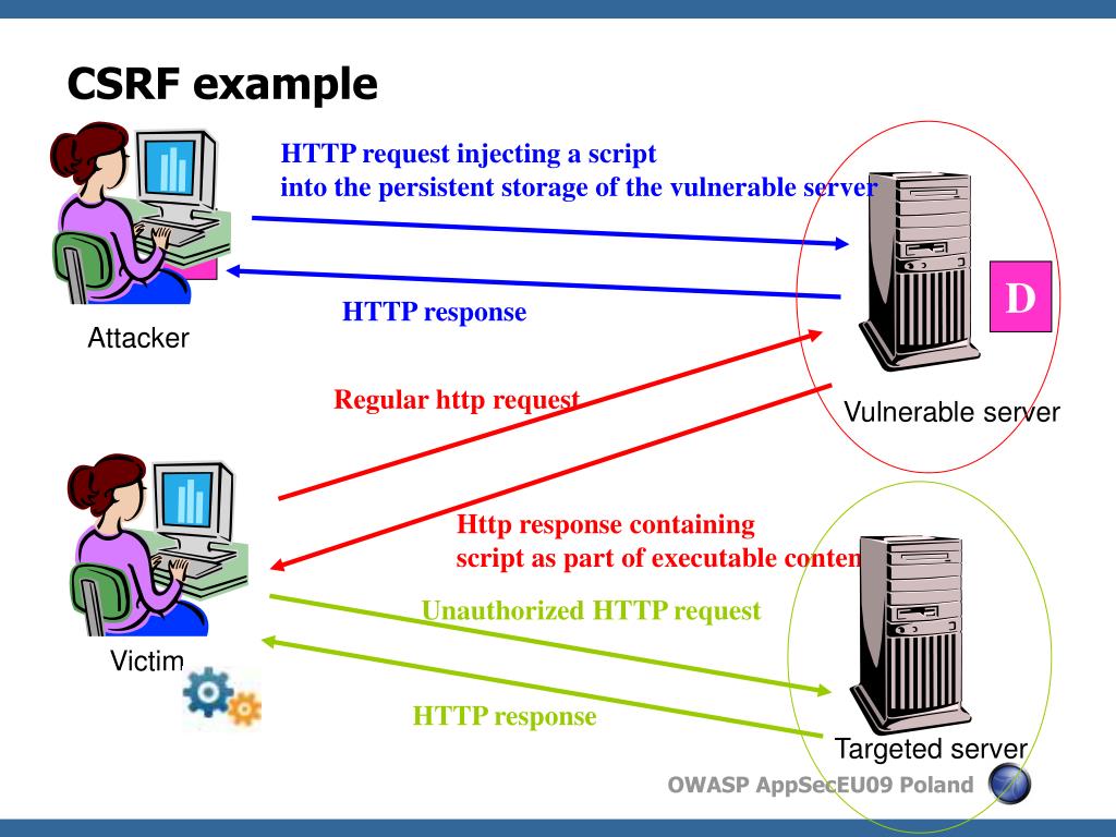 CSRF example HTTP request injecting a script into the persistent storage of the vulnerable server D D HTTP response Attacker Regular http request Vulnerable server Http response containing script as part of executable content Unauthorized HTTP request Victim HTTP response Targeted server
