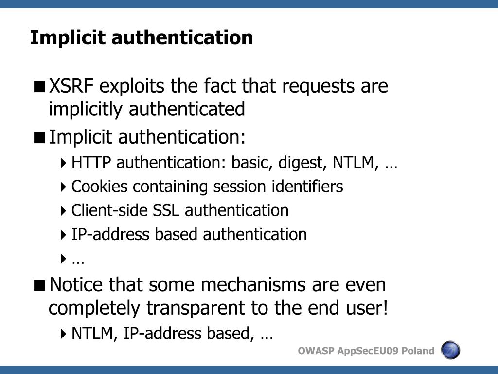 Implicit authentication • XSRF exploits the fact that requests are implicitly authenticated • Implicit authentication: • HTTP authentication: basic, digest, NTLM, … • Cookies containing session identifiers • Client-side SSL authentication • IP-address based authentication • … • Notice that some mechanisms are even completely transparent to the end user! • NTLM, IP-address based, …