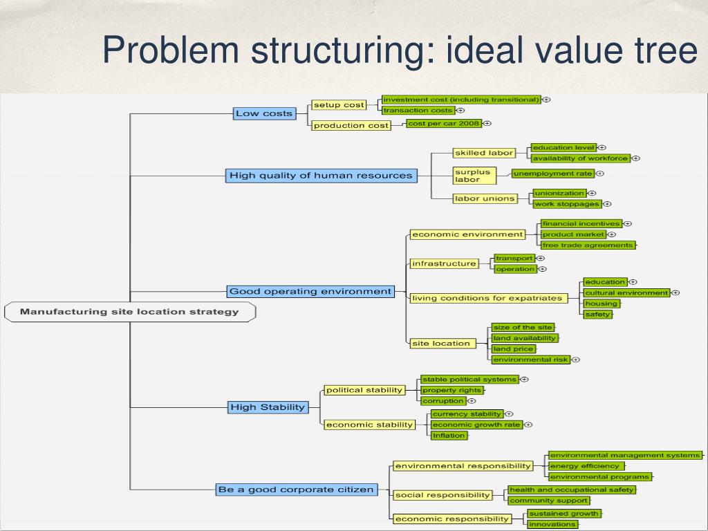 Problem Structuring: adapted value tree “Adapted value tree” and the relevant criteria with respect to available data and preferences: