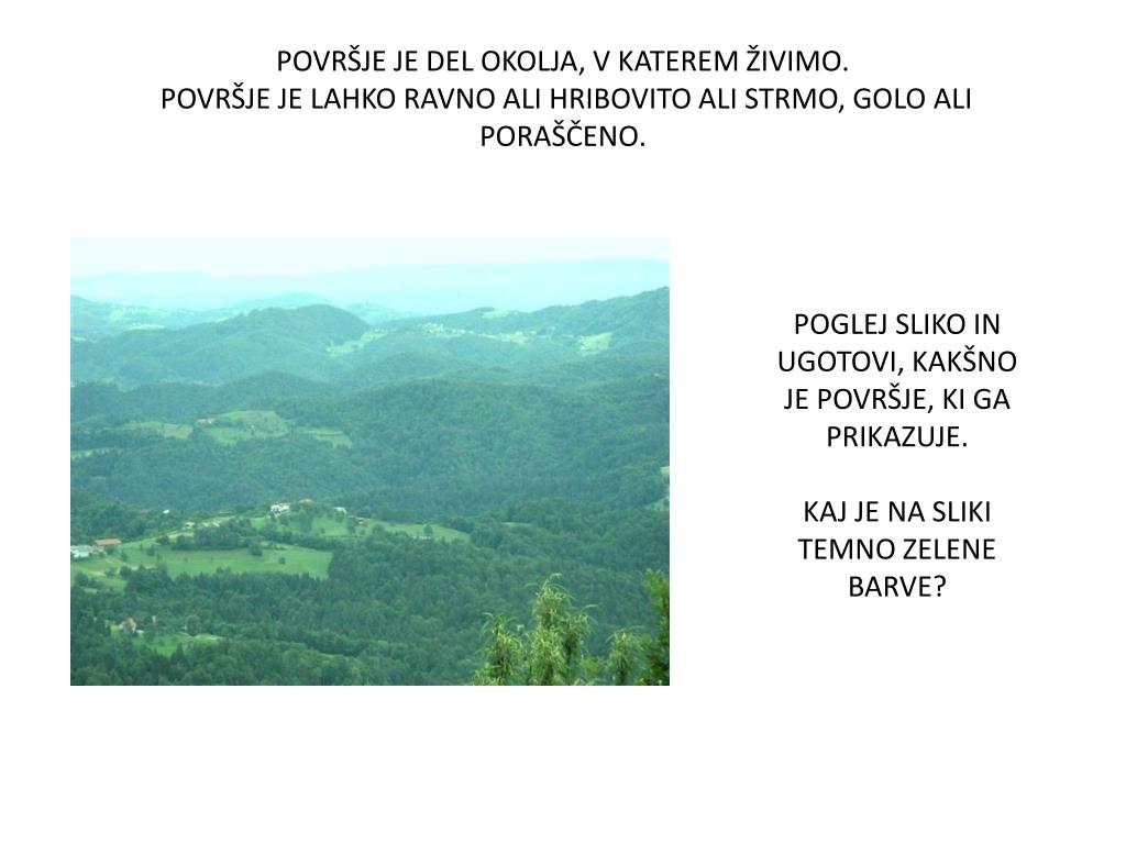 POVRŠJE JE DEL OKOLJA, V KATEREM ŽIVIMO. POVRŠJE JE LAHKO RAVNO ALI HRIBOVITO ALI STRMO, GOLO ALI PORAŠČENO. POGLEJ SLIKO IN UGOTOVI, KAKŠNO JE POVRŠJE, KI GA PRIKAZUJE. KAJ JE NA SLIKI TEMNO ZELENE BARVE?