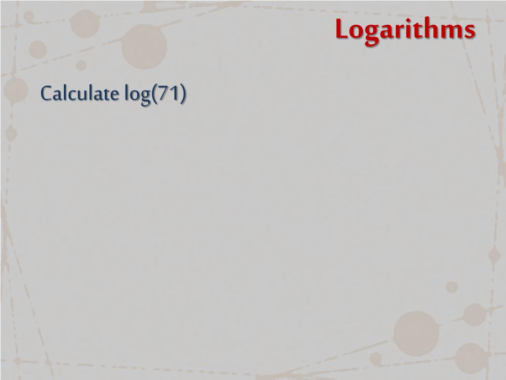 Exponents Understanding and using exponents and logarithms will be essential in chemistry. multiplying common bases: 33*32 = 33+2 dividing common bases: 33÷32= 33–2 base 10 logarithms: log10(100) = 2 102 = 100 natural logarithms: loge(148.4) = 5 e5= 148.4