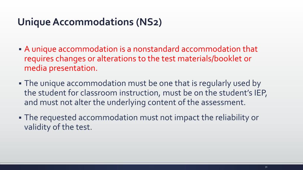 Unique Accommodations (NS2) • A unique accommodation is a nonstandard accommodation that requires changes or alterations to the test materials/booklet or media presentation. • The unique accommodation must be one that is regularly used by the student for classroom instruction, must be on the student’s IEP, and must not alter the underlying content of the assessment. • The requested accommodation must not impact the reliability or validity of the test.