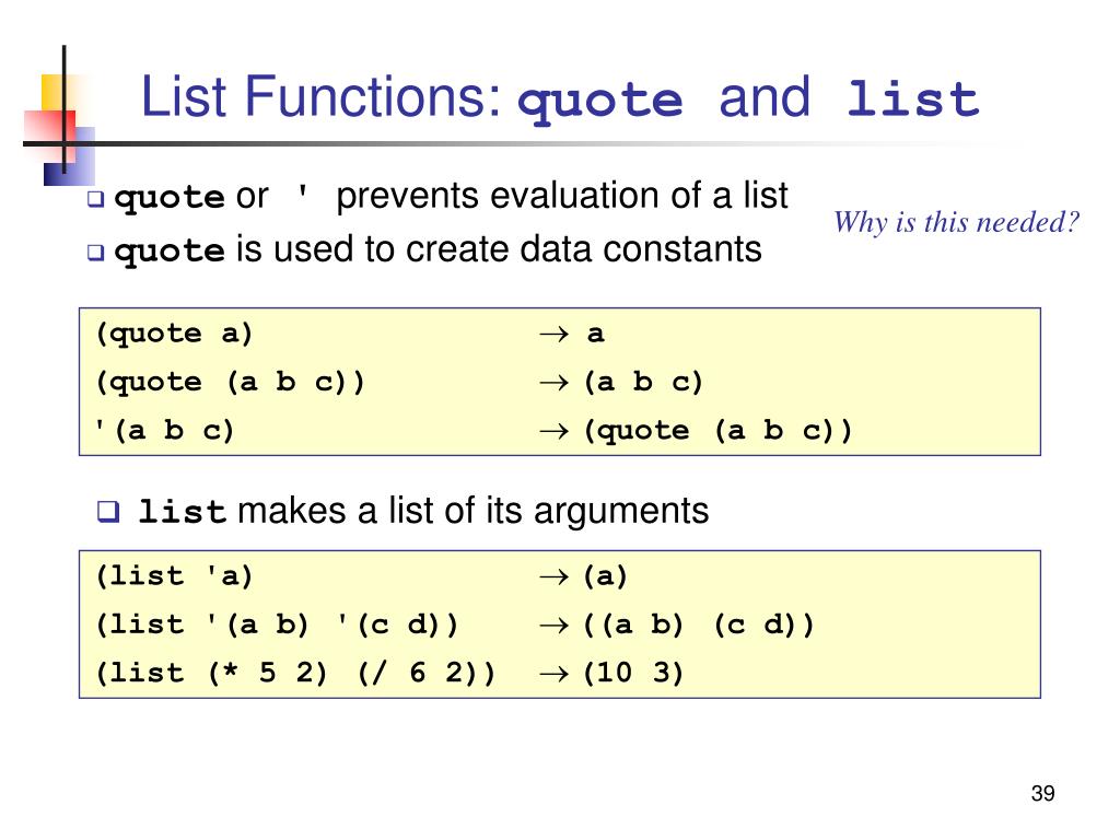 List Functions: quote and list • quote or ' prevents evaluation of a list • quote is used to create data constants Why is this needed? (quote a)a (quote (a b c))(a b c) '(a b c)(quote (a b c)) • list makes a list of its arguments (list 'a) (a) (list '(a b) '(c d)) ((a b) (c d)) (list (* 5 2) (/ 6 2)) (10 3)
