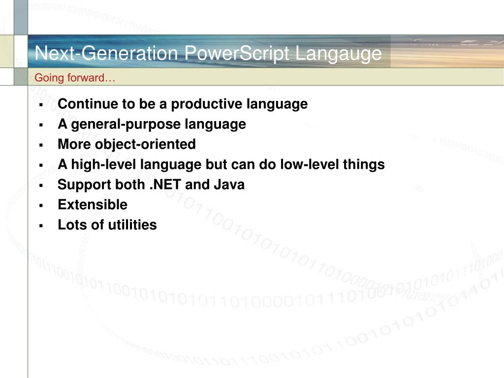 Next-Generation PowerScript Langauge Going forward… • Continue to be a productive language • A general-purpose language • More object-oriented • A high-level language but can do low-level things • Support both .NET and Java • Extensible • Lots of utilities