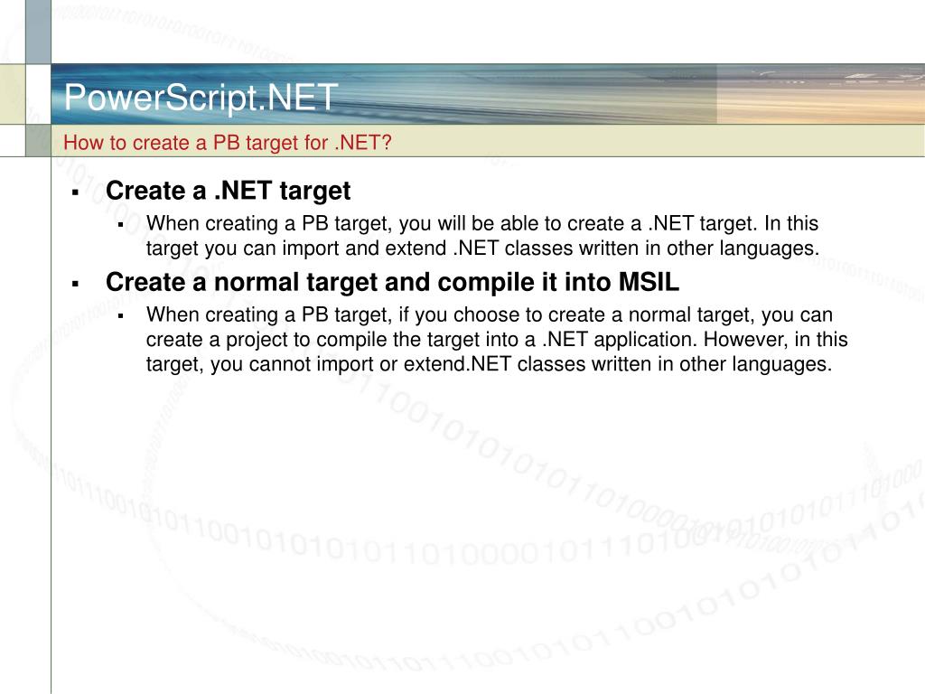 PowerScript.NET How to create a PB target for .NET? • Create a .NET target • When creating a PB target, you will be able to create a .NET target. In this target you can import and extend .NET classes written in other languages. • Create a normal target and compile it into MSIL • When creating a PB target, if you choose to create a normal target, you can create a project to compile the target into a .NET application. However, in this target, you cannot import or extend.NET classes written in other languages.