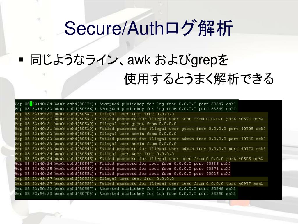 より容易にするために テキスト解析ツールを使用するより容易にするために テキスト解析ツールを使用する • ここに挙げた例はすべてFreeBSD 4.9の デフォルトログインシステムに基づいている