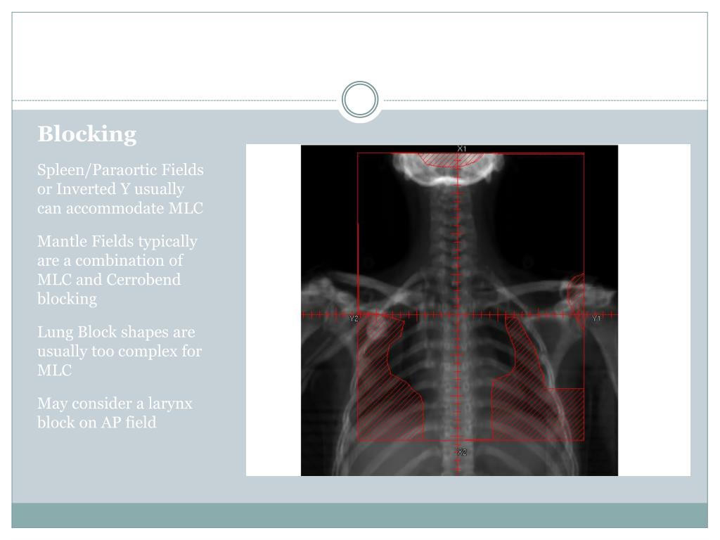 Blocking Spleen/Paraortic Fields or Inverted Y usually can accommodate MLC Mantle Fields typically are a combination of MLC and Cerrobend blocking Lung Block shapes are usually too complex for MLC May consider a larynx block on AP field