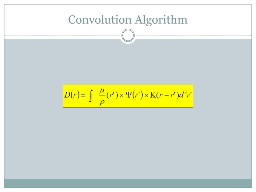 Modeling – Convolution Algorithm An integral that calculates at every point within the dose grid. That dose calculation includes the attenuation of the beam as it travels through tissue times the energy fluence of energy spectrum times the energy kernel.