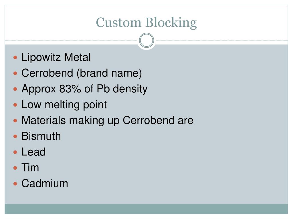 Custom Blocking • Lipowitz Metal • Cerrobend (brand name) • Approx 83% of Pb density • Low melting point • Materials making up Cerrobend are • Bismuth • Lead • Tim • Cadmium