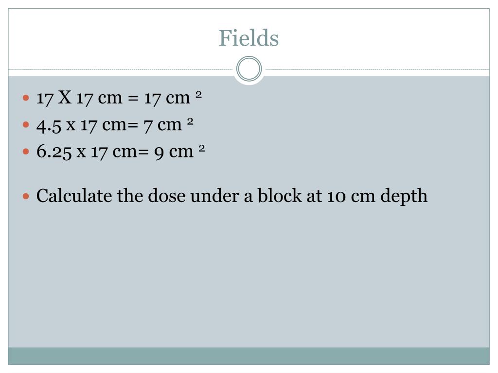 Fields 17 X 17 cm = 17 cm 2 4.5 x 17 cm= 7 cm 2 6.25 x 17 cm= 9 cm 2 Calculate the dose under a block at 10 cm depth