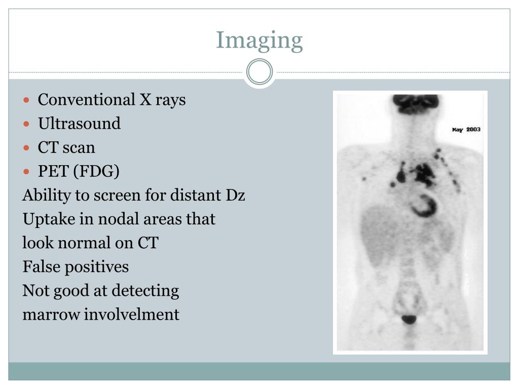 Imaging Conventional X rays Ultrasound CT scan PET (FDG) Ability to screen for distant Dz Uptake in nodal areas that look normal on CT False positives Not good at detecting marrow involvelment