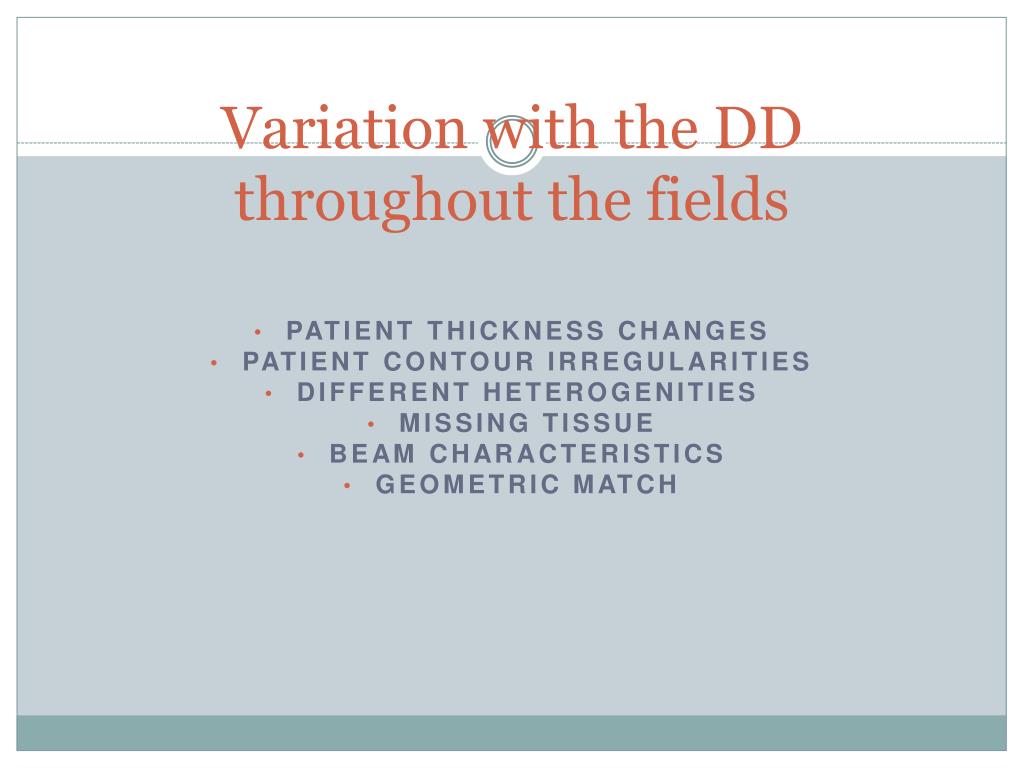 PATIENT THICKNESS CHANGES PATIENT CONTOUR IRREGULARITIES DIFFERENT HETEROGENITIES MISSING TISSUE BEAM CHARACTERISTICS GEOMETRIC MATCH Variation with the DD throughout the fields