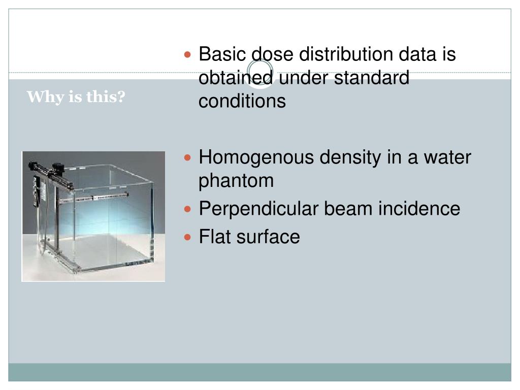 Why is this? • Basic dose distribution data is obtained under standard conditions • Homogenous density in a water phantom • Perpendicular beam incidence • Flat surface