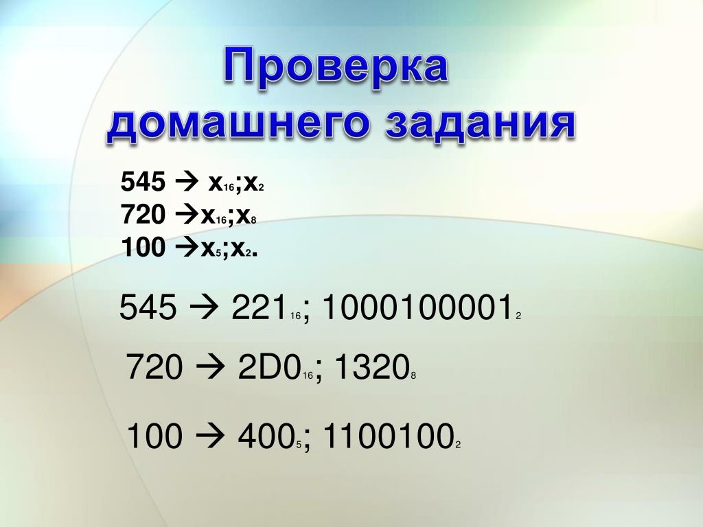 Проверка домашнего задания 545 х16;х2 720х16;х8 100х5;х2. 545 22116; 10001000012 720 2D016; 13208 100 4005; 11001002
