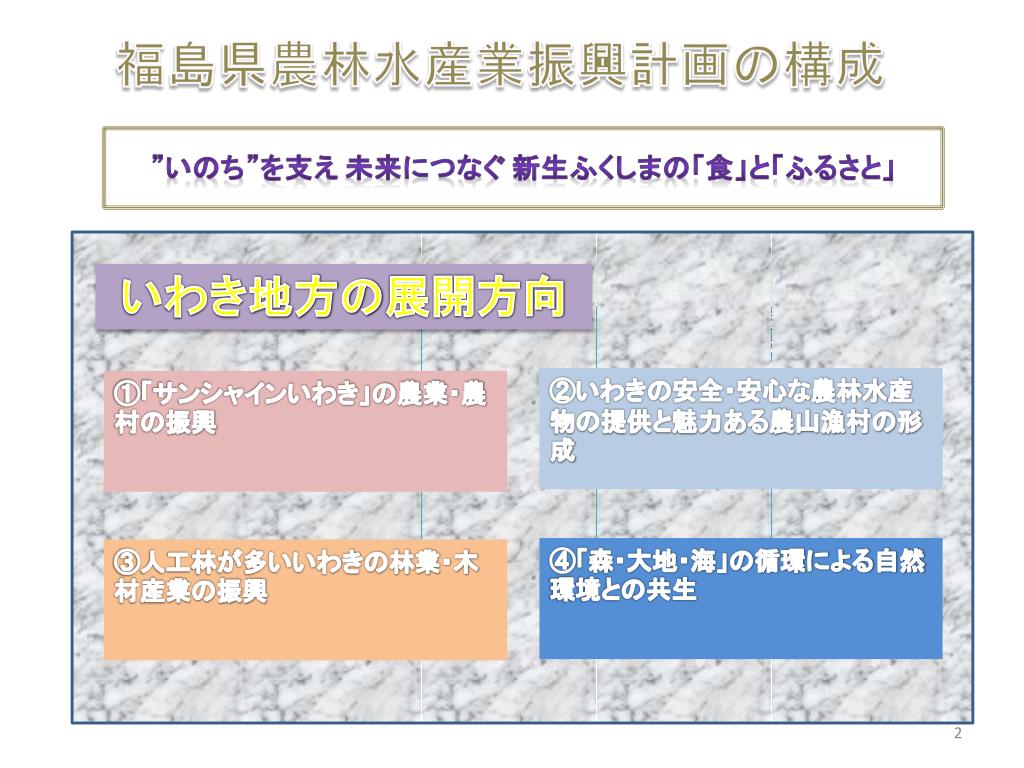 林業・木材 産業の振興. 福島県農林水産業振興計画の構成. ”いのち”を支え 未来につなぐ 新生ふくしまの「食」と「ふるさと」. 県全体の展開方向. いわき地方の 展開方向. 東日本大震災及び 原子力災害からの復興. 安全・安心な 農林水産物の提供. 農業の振興. 林業・木材産業の振興. 水産業の振興. 魅力ある 農山漁村の形成. 自然・環境との共生. ②いわきの安全・安心な農林水産物の提供と魅力ある農山漁村の形成. ①「サンシャインいわき」の農業・農村の振興. ④「森・大地・海」の循環による自然環境との共生.