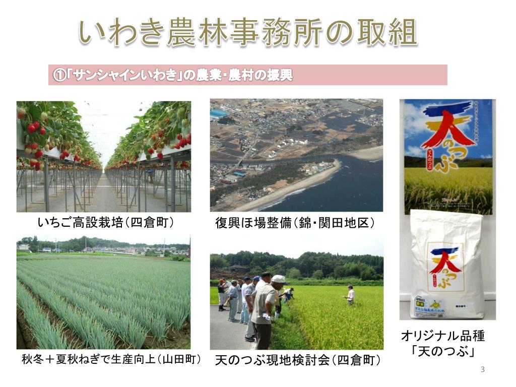 いわき農林事務所の取組 ①「サンシャインいわき」の農業・農村の振興 いちご高設栽培(四倉町) 復興ほ場整備(錦・関田地区) オリジナル品種 「天のつぶ」 秋冬+夏秋ねぎで生産向上(山田町) 天のつぶ現地検討会(四倉町)