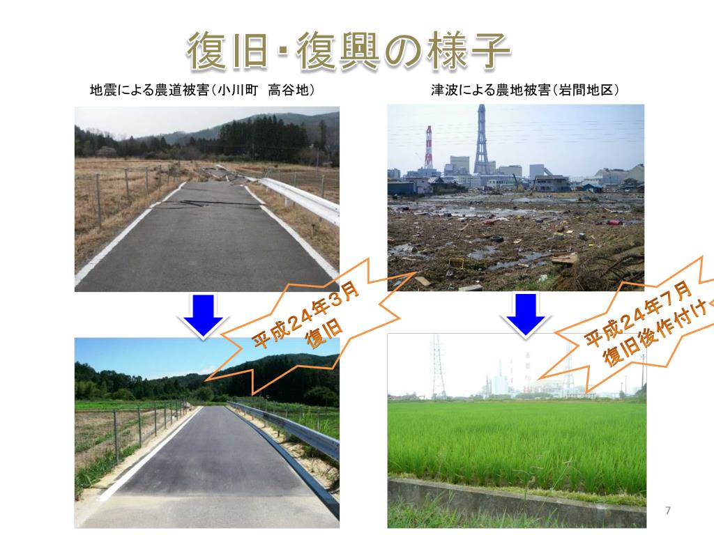 復旧・復興の様子 地震による農道被害(小川町 高谷地) 津波による農地被害(岩間地区) 平成24年7月 復旧後作付け 平成24年3月 復旧