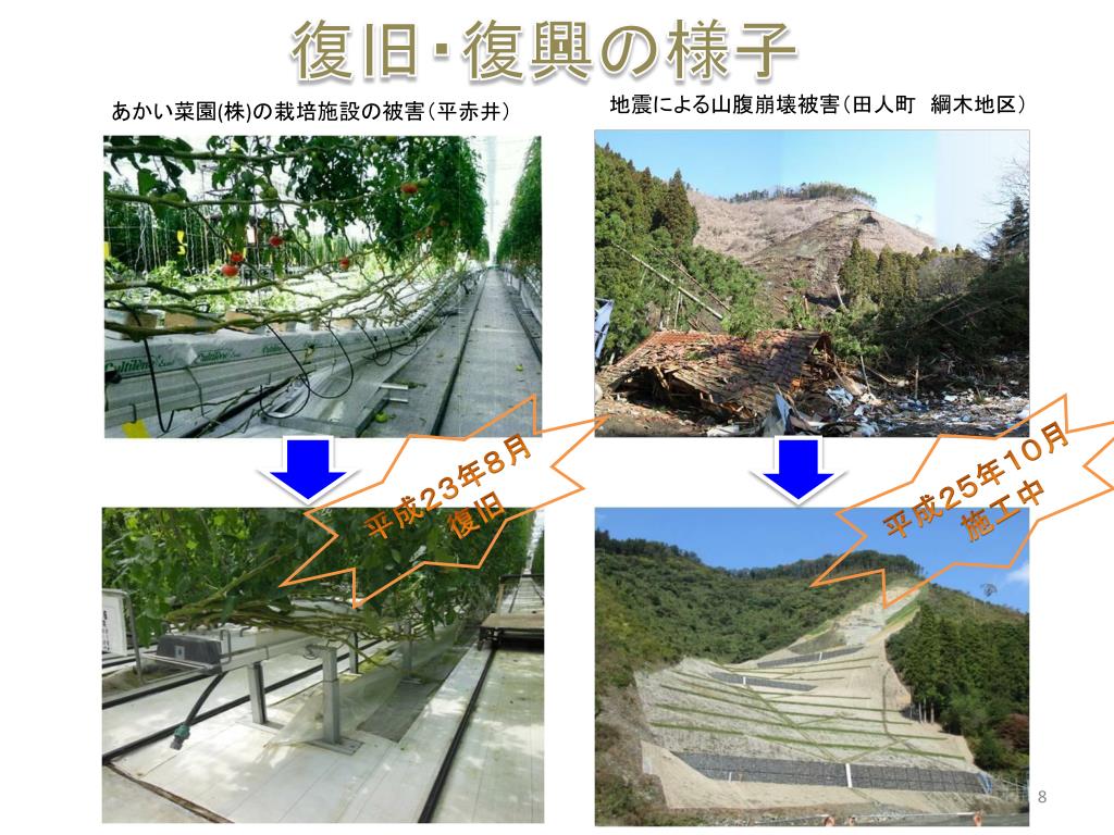 復旧・復興の様子 地震による山腹崩壊被害(田人町 綱木地区) あかい菜園(株)の栽培施設の被害(平赤井) 平成25年10月 施工中 平成23年8月 復旧
