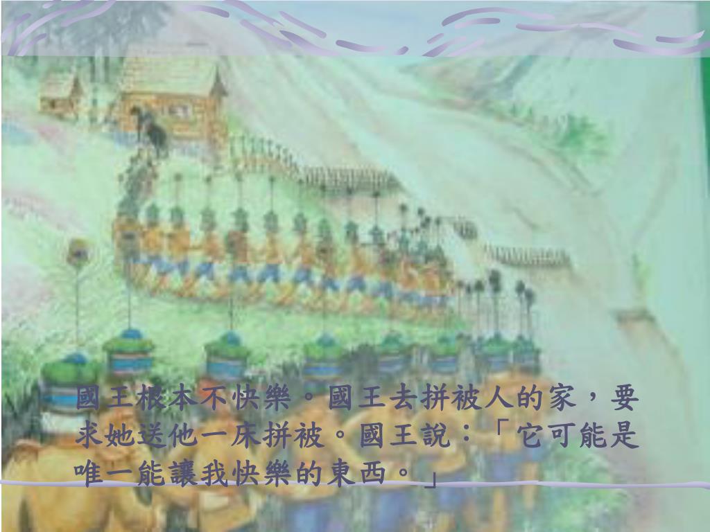 國王根本不快樂。國王去拼被人的家,要求她送他一床拼被。國王說:「它可能是唯一能讓我快樂的東西。」國王根本不快樂。國王去拼被人的家,要求她送他一床拼被。國王說:「它可能是唯一能讓我快樂的東西。」