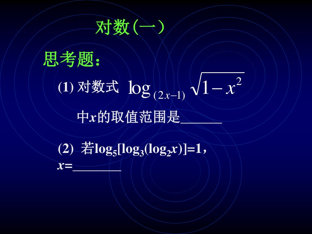 思考题: (1) 对数式 中x的取值范围是______ (2) 若log5[log3(log2x)]=1,x=_______ 对数(一)