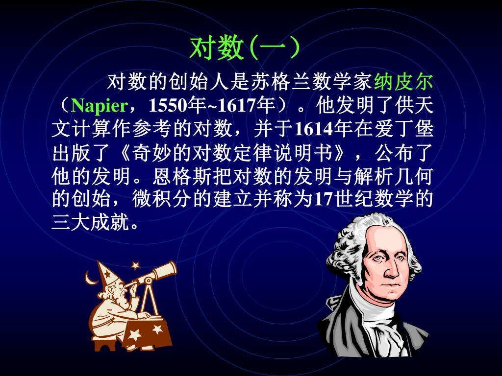 对数(一) 对数的创始人是苏格兰数学家纳皮尔(Napier,1550年~1617年)。他发明了供天文计算作参考的对数,并于1614年在爱丁堡出版了《奇妙的对数定律说明书》,公布了他的发明。恩格斯把对数的发明与解析几何的创始,微积分的建立并称为17世纪数学的三大成就。