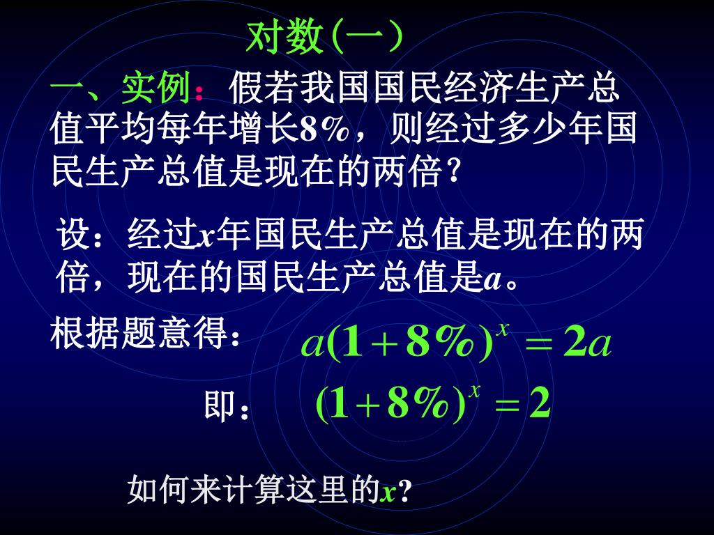 对数(一) 一、实例:假若我国国民经济生产总值平均每年增长8%,则经过多少年国民生产总值是现在的两倍? 设:经过x年国民生产总值是现在的两倍,现在的国民生产总值是a。 根据题意得: 即: 如何来计算这里的x?