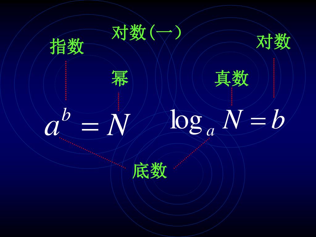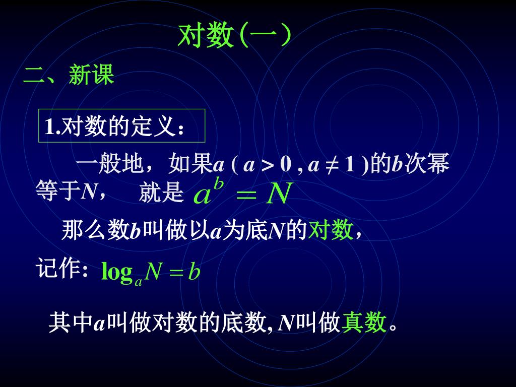 记作: 就是 对数(一) 二、新课 1.对数的定义: 一般地,如果a ( a > 0 , a ≠ 1 )的b次幂等于N, 那么数b叫做以a为底N的对数, 其中a叫做对数的底数, N叫做真数。
