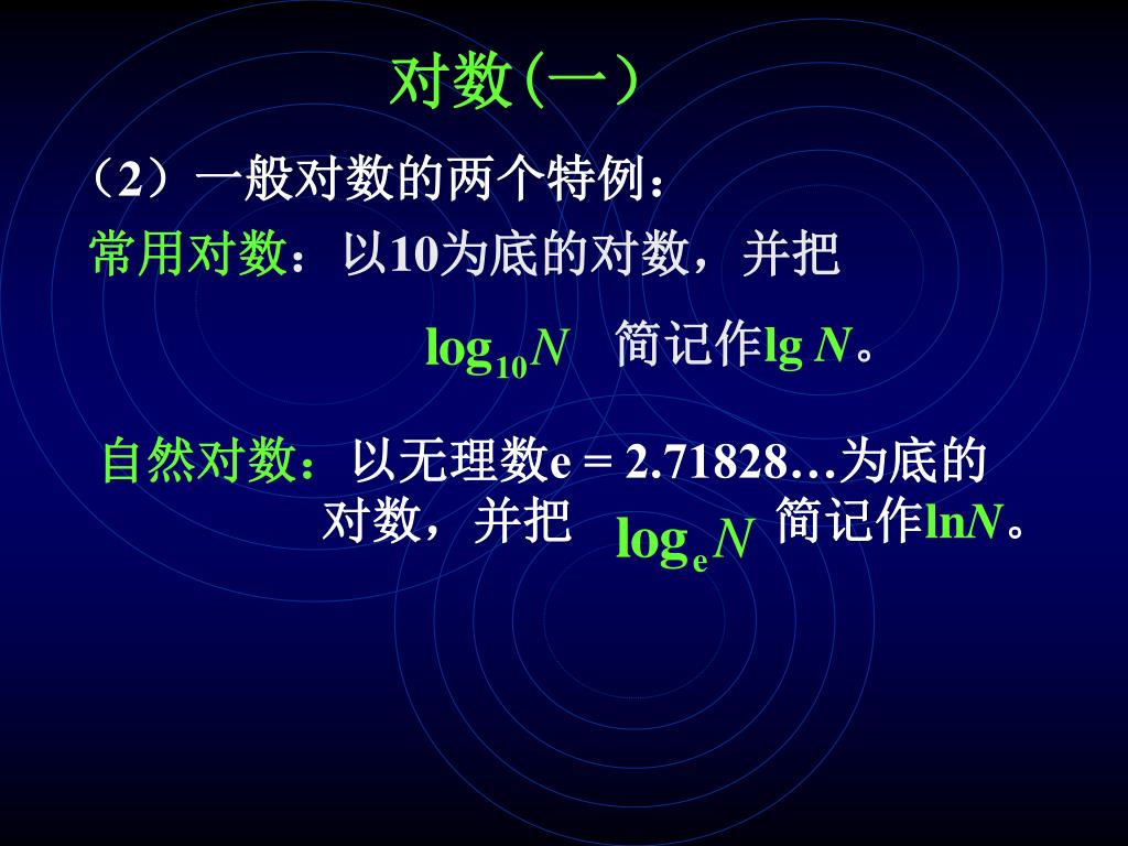 常用对数:以10为底的对数,并把 简记作lg N。 自然对数:以无理数e = 2.71828…为底的 对数,并把 简记作lnN。 对数(一) (2)一般对数的两个特例: