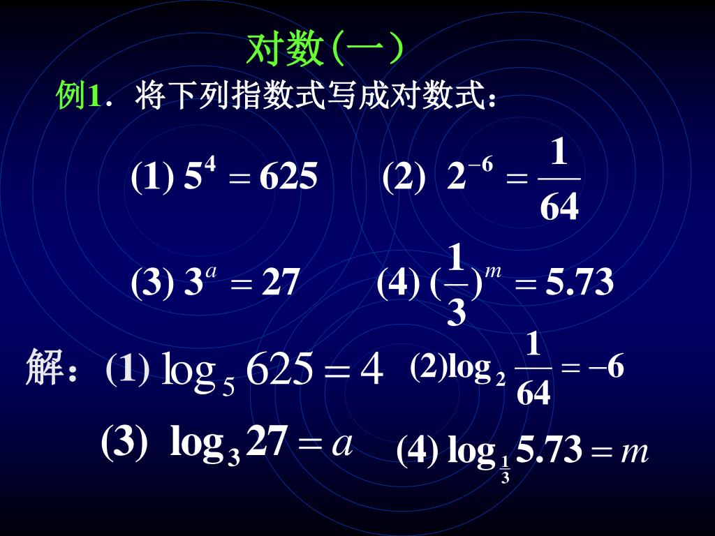 对数(一) 例1.将下列指数式写成对数式: 解:(1)