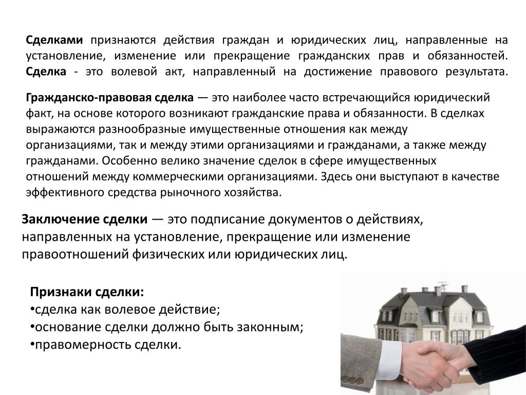 Сделками признаются действия граждан и юридических лиц, направленные на установление, изменение или прекращение гражданских прав и обязанностей. Сделка - это волевой акт, направленный на достижение правового результата. Гражданско-правовая сделка — это наиболее часто встречающийся юридический факт, на основе которого возникают гражданские права и обязанности. В сделках выражаются разнообразные имущественные отношения как между организациями, так и между этими организациями и гражданами, а также между гражданами. Особенно велико значение сделок в сфере имущественных отношений между коммерческими организациями. Здесь они выступают в качестве эффективного средства рыночного хозяйства. Заключение сделки— это подписание документов о действиях, направленных на установление, прекращение или изменение правоотношений физических или юридических лиц. • Признаки сделки: • сделка как волевое действие; • основание сделки должно быть законным; • правомерность сделки.