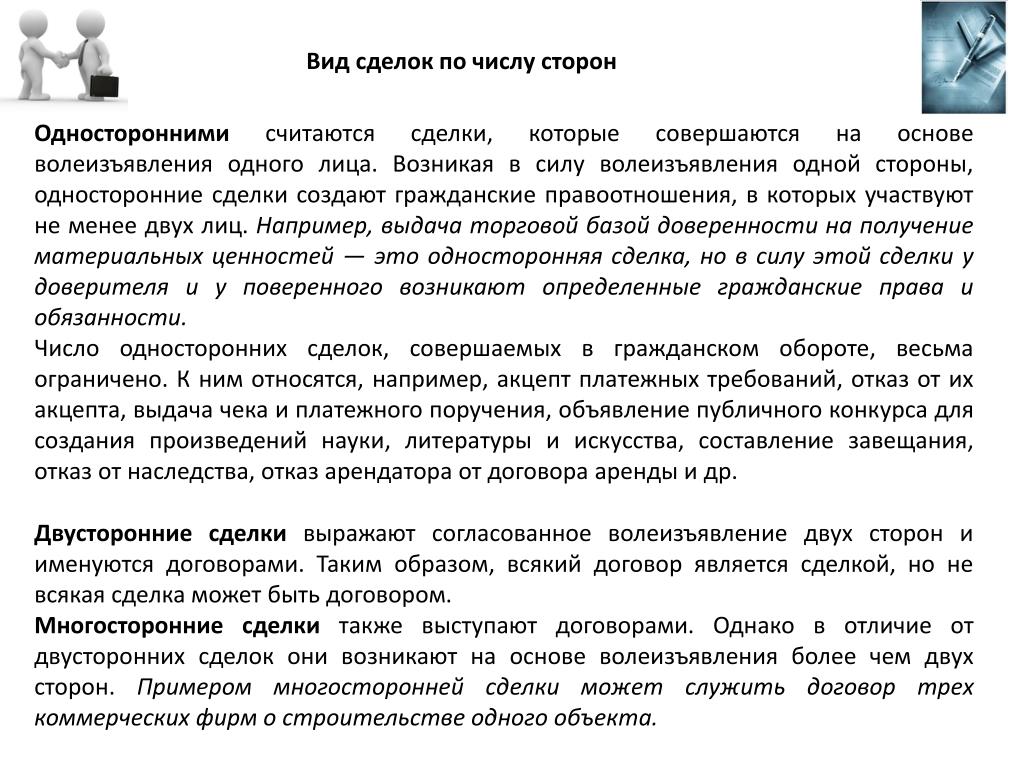 Вид сделок по числу сторон Односторонними считаются сделки, которые совершаются на основе волеизъявления одного лица. Возникая в силу волеизъявления одной стороны, односторонние сделки создают гражданские правоотношения, в которых участвуют не менее двух лиц. Например, выдача торговой базой доверенности на получение материальных ценностей — это односторонняя сделка, но в силу этой сделки у доверителя и у поверенного возникают определенные гражданские права и обязанности. Число односторонних сделок, совершаемых в гражданском обороте, весьма ограничено. К ним относятся, например, акцепт платежных требований, отказ от их акцепта, выдача чека и платежного поручения, объявление публичного конкурса для создания произведений науки, литературы и искусства, составление завещания, отказ от наследства, отказ арендатора от договора аренды и др. Двусторонние сделки выражают согласованное волеизъявление двух сторон и именуются договорами. Таким образом, всякий договор является сделкой, но не всякая сделка может быть договором. Многосторонние сделки также выступают договорами. Однако в отличие от двусторонних сделок они возникают на основе волеизъявления более чем двух сторон. Примером многосторонней сделки может служить договор трех коммерческих фирм о строительстве одного объекта.
