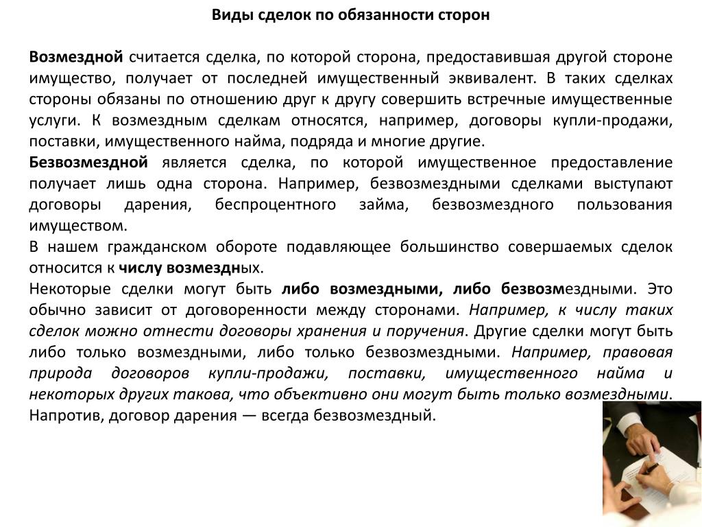 Виды сделок по обязанности сторон Возмездной считается сделка, по которой сторона, предоставившая другой стороне имущество, получает от последней имущественный эквивалент. В таких сделках стороны обязаны по отношению друг к другу совершить встречные имущественные услуги. К возмездным сделкам относятся, например, договоры купли-продажи, поставки, имущественного найма, подряда и многие другие. Безвозмездной является сделка, по которой имущественное предоставление получает лишь одна сторона. Например, безвозмездными сделками выступают договоры дарения, беспроцентного займа, безвозмездного пользования имуществом. В нашем гражданском обороте подавляющее большинство совершаемых сделок относится к числу возмездных. Некоторые сделки могут быть либо возмездными, либо безвозмездными. Это обычно зависит от договоренности между сторонами. Например, к числу таких сделок можно отнести договоры хранения и поручения. Другие сделки могут быть либо только возмездными, либо только безвозмездными. Например, правовая природа договоров купли-продажи, поставки, имущественного найма и некоторых других такова, что объективно они могут быть только возмездными. Напротив, договор дарения — всегда безвозмездный.