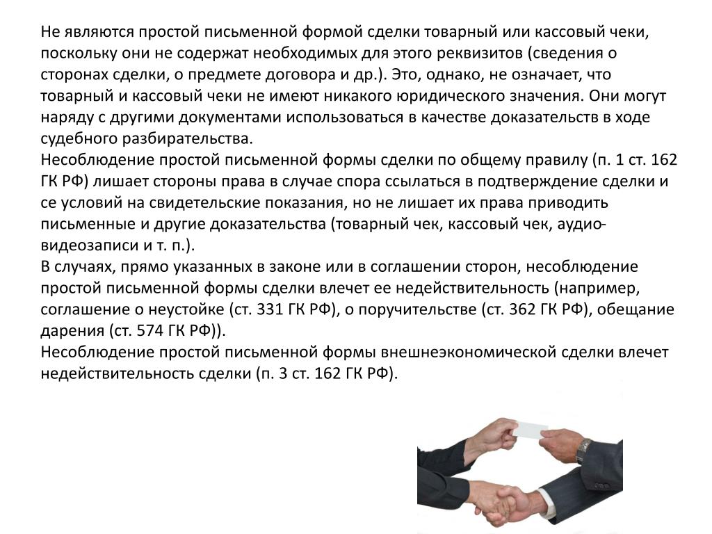 Не являются простой письменной формой сделки товарный или кассовый чеки, поскольку они не содержат необходимых для этого реквизитов (сведения о сторонах сделки, о предмете договора и др.). Это, однако, не означает, что товарный и кассовый чеки не имеют никакого юридического значения. Они могут наряду с другими документами использоваться в качестве доказательств в ходе судебного разбирательства. Несоблюдение простой письменной формы сделки по общему правилу (п. 1 ст. 162 ГК РФ) лишает стороны права в случае спора ссылаться в подтверждение сделки и се условий на свидетельские показания, но не лишает их права приводить письменные и другие доказательства (товарный чек, кассовый чек, аудио- видеозаписи и т. п.). В случаях, прямо указанных в законе или в соглашении сторон, несоблюдение простой письменной формы сделки влечет ее недействительность (например, соглашение о неустойке (ст. 331 ГК РФ), о поручительстве (ст. 362 ГК РФ), обещание дарения (ст. 574 ГК РФ)). Несоблюдение простой письменной формы внешнеэкономической сделки влечет недействительность сделки (п. 3 ст. 162 ГК РФ).