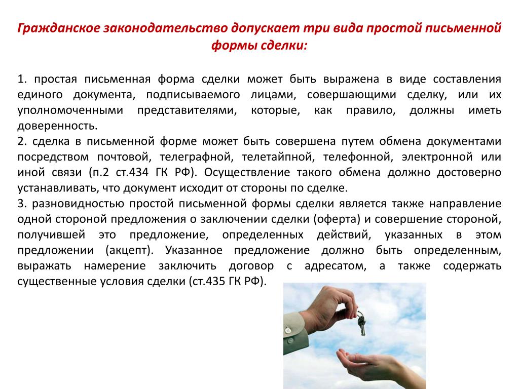Гражданское законодательство допускает три вида простой письменной формы сделки: 1. простая письменная форма сделки может быть выражена в виде составления единого документа, подписываемого лицами, совершающими сделку, или их уполномоченными представителями, которые, как правило, должны иметь доверенность. 2. сделка в письменной форме может быть совершена путем обмена документами посредством почтовой, телеграфной, телетайпной, телефонной, электронной или иной связи (п.2 ст.434 ГК РФ). Осуществление такого обмена должно достоверно устанавливать, что документ исходит от стороны по сделке. 3. разновидностью простой письменной формы сделки является также направление одной стороной предложения о заключении сделки (оферта) и совершение стороной, получившей это предложение, определенных действий, указанных в этом предложении (акцепт). Указанное предложение должно быть определенным, выражать намерение заключить договор с адресатом, а также содержать существенные условия сделки (ст.435 ГК РФ).