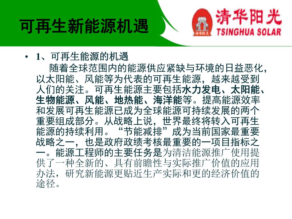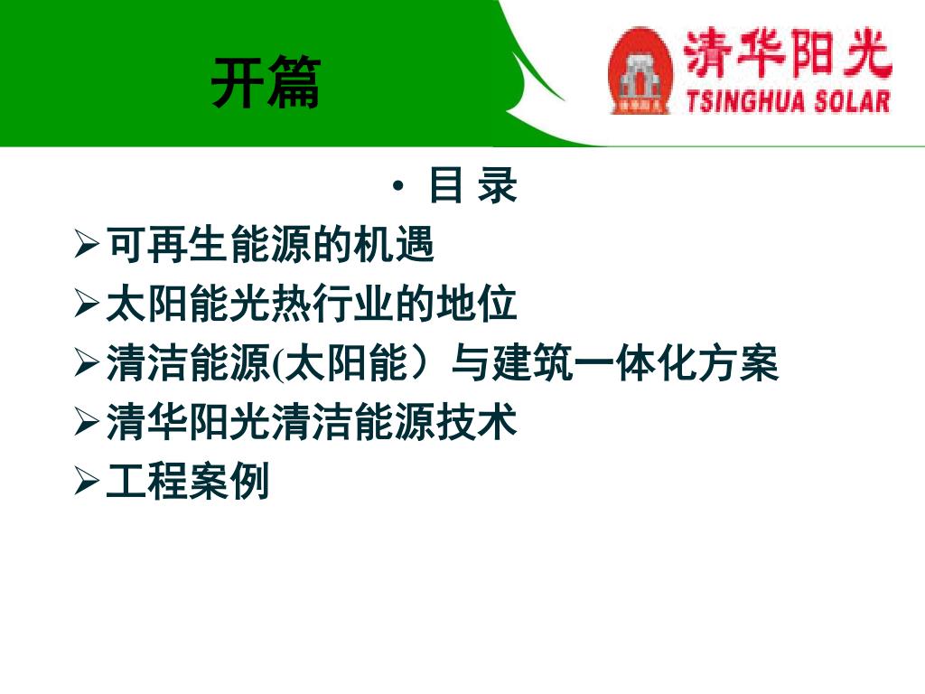 开篇 • 目 录 • 可再生能源的机遇 • 太阳能光热行业的地位 • 清洁能源(太阳能)与建筑一体化方案 • 清华阳光清洁能源技术 • 工程案例