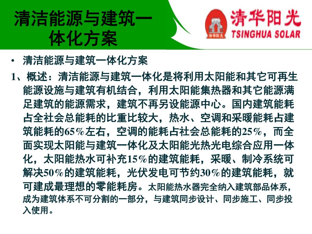 清洁能源与建筑一体化方案 • 清华阳光公司的解决措施 1、提高太阳能设备热效率,采用新型介质和新型真空玻璃管(金刚无水管)技术。 2、使用玻璃热管技术和高端镀膜技术,和新型的辅助能源。 3、改变安装型式(壁挂式)。 4、系统集成技术的应用。