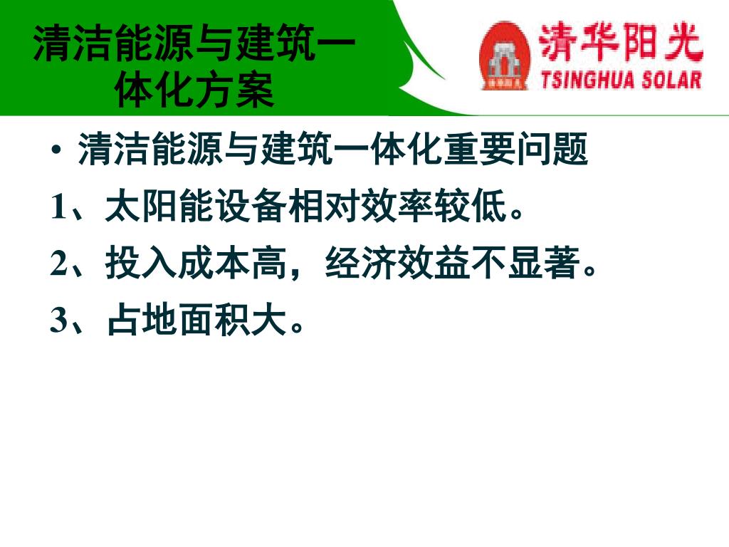 清洁能源与建筑一体化方案 • 清洁能源与建筑一体化重要问题 1、太阳能设备相对效率较低。 2、投入成本高,经济效益不显著。 3、占地面积大。