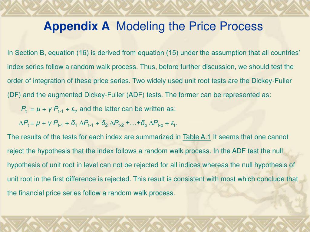 Appendix A Modeling the Price Process Similarly, in the U.S. stock markets, the Phillips-Perron test is used to check the whether the value-weighted price of market portfolio follows a random walk process. The results of the tests for each index are summarized in Table A.2. It seems that one cannot reject the hypothesis that all indices follow a random walk process since, for example, the null hypothesis of unit root in level cannot be rejected for all indices but are all rejected if one assumes there is a unit root in the first order difference of the price for each portfolio. This result is consistent with most studies concluding the financial price series follow a random walk process.