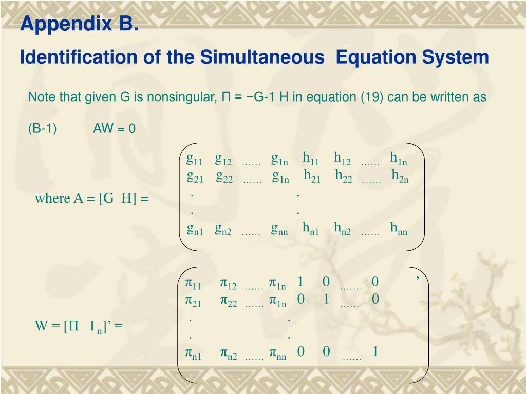 g11 g12 …… g1n h11 h12 …… h1n g21 g22 …… g1n h21 h22 …… h2n . . . . gn1 gn2 …… gnn hn1 hn2 …… hnn where A = [G H] = π11 π12 …… π1n 1 0 …… 0 ’ π21 π22 …… π1n 0 1 …… 0 . . . . πn1πn2 …… πnn 0 0 …… 1 W = [Π I n]’ = Appendix B. Identification of the Simultaneous Equation System Note that given G is nonsingular, Π = −G-1 H in equation (19) can be written as (B-1) AW = 0