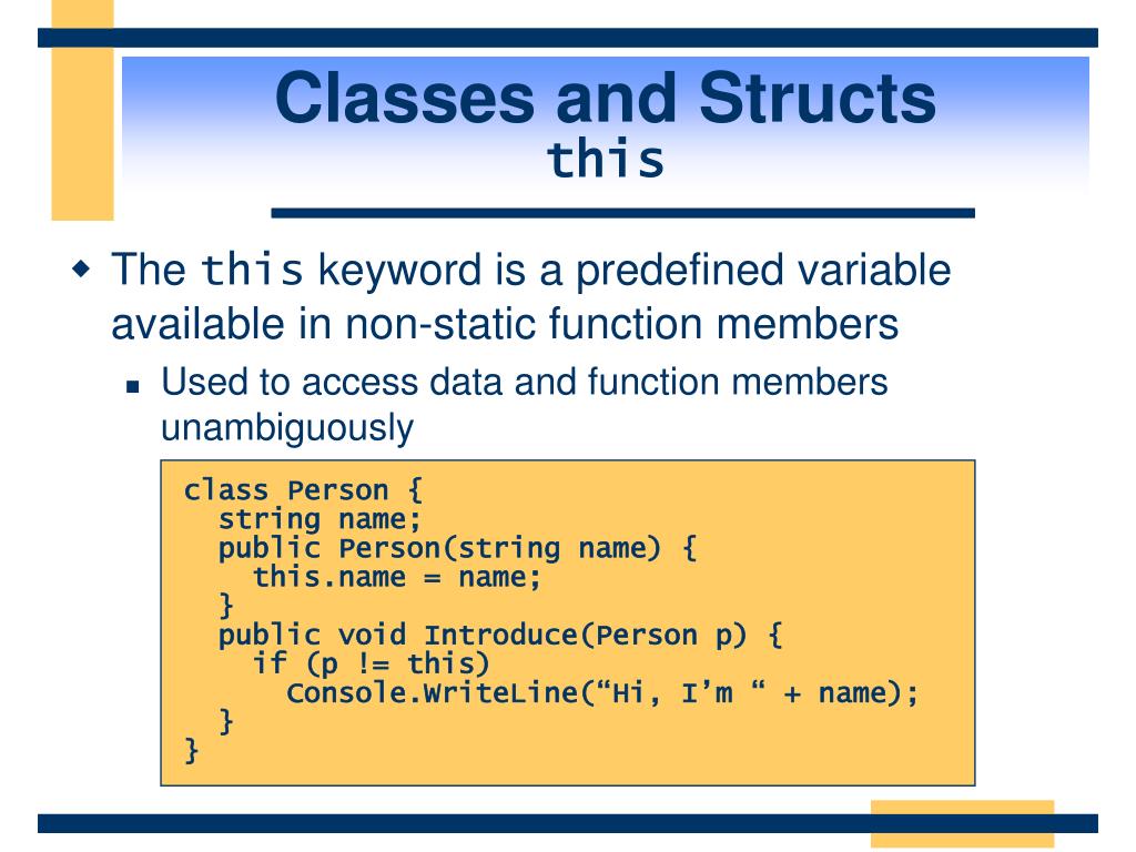 Classes and Structsthis • The this keyword is a predefined variable available in non-static function members • Used to access data and function members unambiguously class Person { string name; public Person(string name) { this.name = name; } public void Introduce(Person p) { if (p != this) Console.WriteLine(“Hi, I’m “ + name); } }