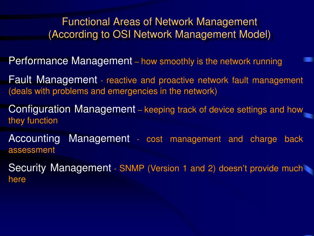 Functional Areas of Network Management(According to OSI Network Management Model) Performance Management– how smoothly is the network running Fault Management- reactive and proactive network fault management (deals with problems and emergencies in the network) Configuration Management– keeping track of device settings and how they function Accounting Management- cost management and charge back assessment Security Management- SNMP (Version 1 and 2) doesn’t provide much here