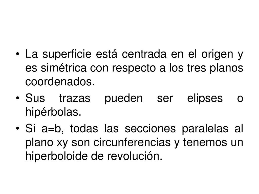 La superficie está centrada en el origen y es simétrica con respecto a los tres planos coordenados. • Sus trazas pueden ser elipses o hipérbolas. • Si a=b, todas las secciones paralelas al plano xy son circunferencias y tenemos un hiperboloide de revolución.