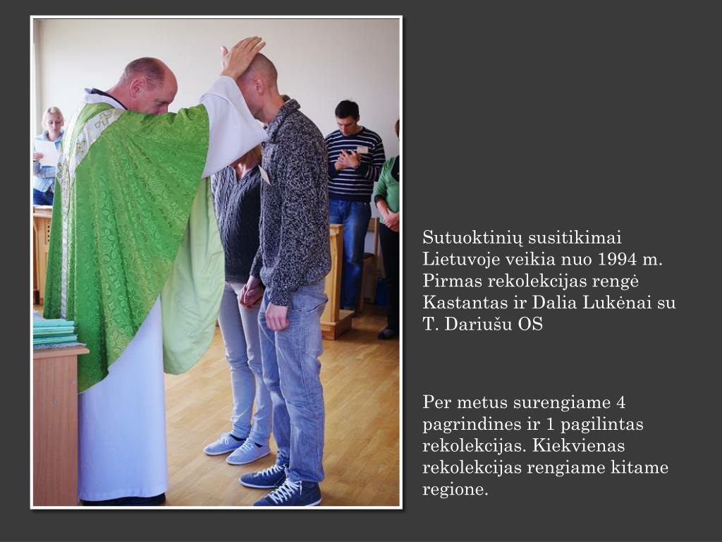 Sutuoktinių susitikimai Lietuvoje veikia nuo 1994 m. Pirmas rekolekcijas rengė Kastantas ir Dalia Lukėnai su T. Dariušu OS Per metus surengiame 4 pagrindines ir 1 pagilintas rekolekcijas. Kiekvienas rekolekcijas rengiame kitame regione.