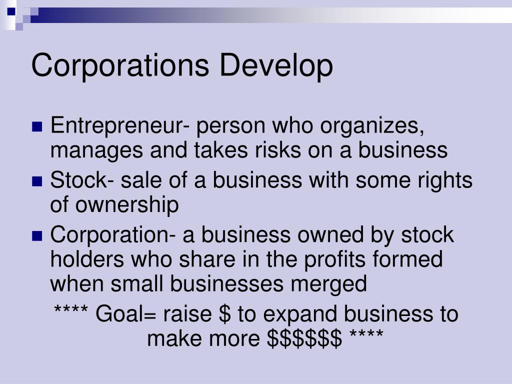 Corporations Develop • Entrepreneur- person who organizes, manages and takes risks on a business • Stock- sale of a business with some rights of ownership • Corporation- a business owned by stock holders who share in the profits formed when small businesses merged **** Goal= raise $ to expand business to make more $$$$$$ ****