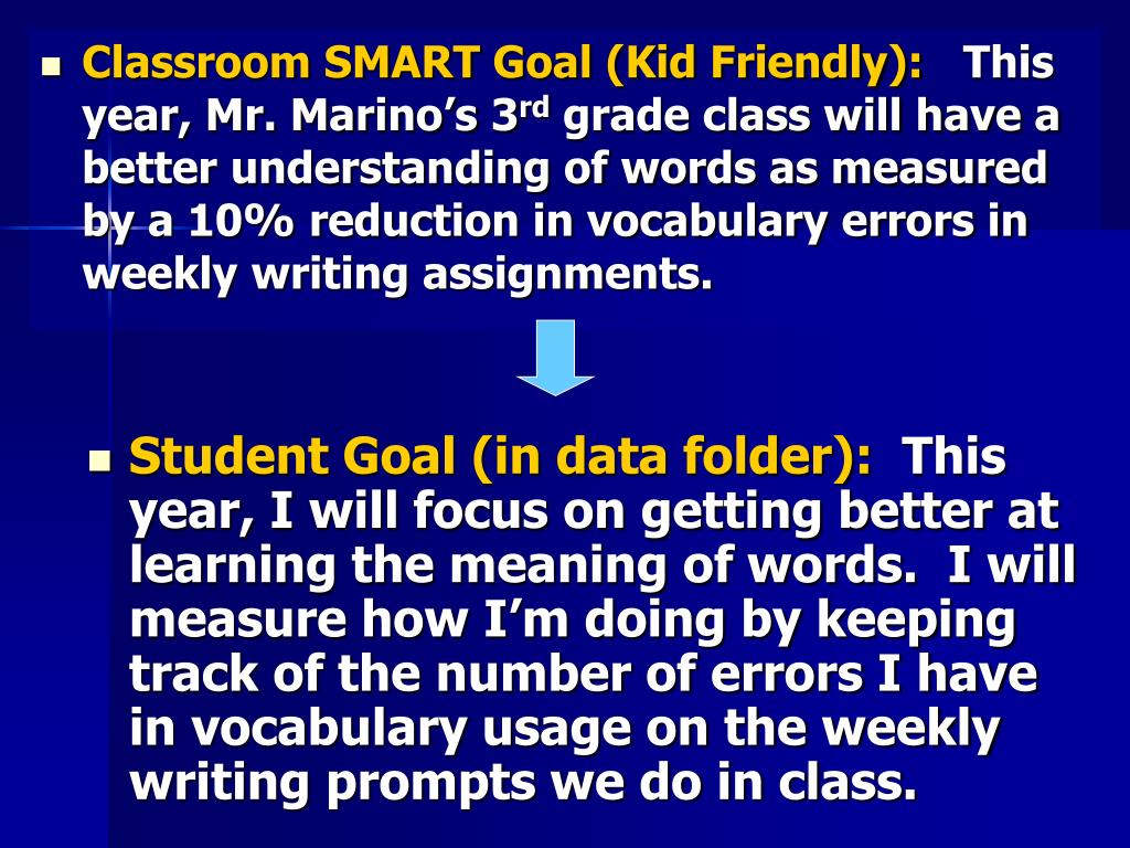 Classroom SMART Goal (Kid Friendly): This year, Mr. Marino’s 3rd grade class will have a better understanding of words as measured by a 10% reduction in vocabulary errors in weekly writing assignments. • Student Goal (in data folder): This year, I will focus on getting better at learning the meaning of words. I will measure how I’m doing by keeping track of the number of errors I have in vocabulary usage on the weekly writing prompts we do in class.